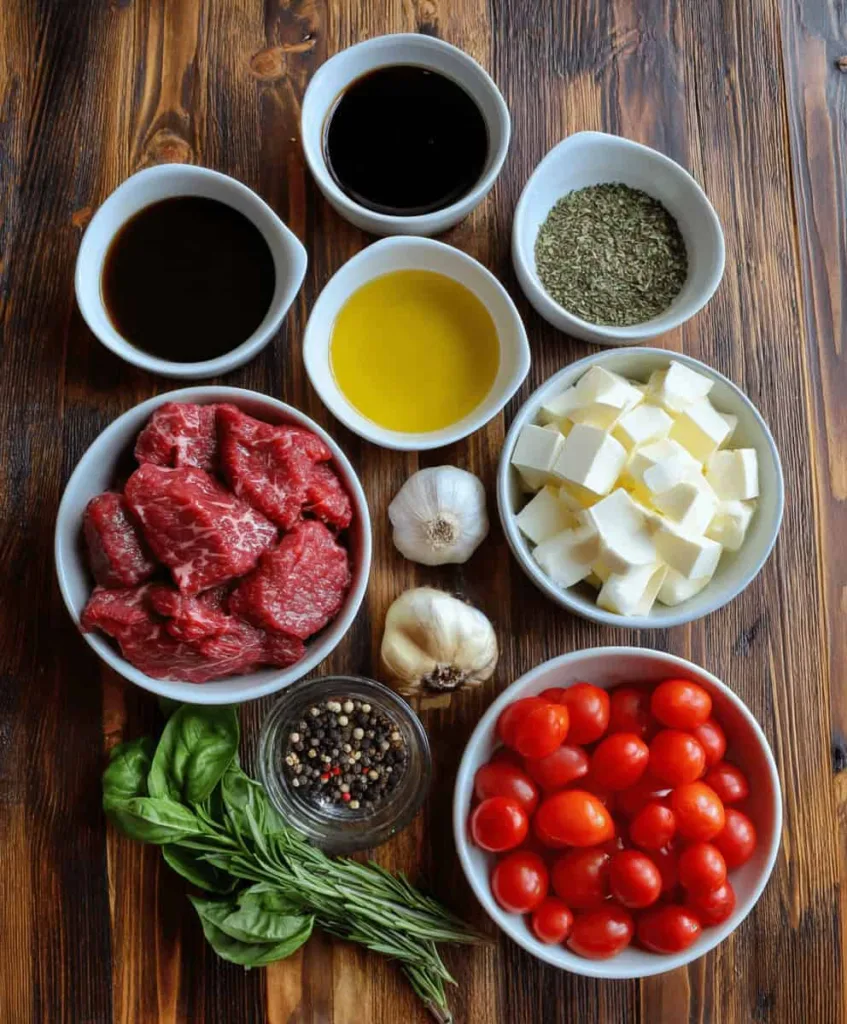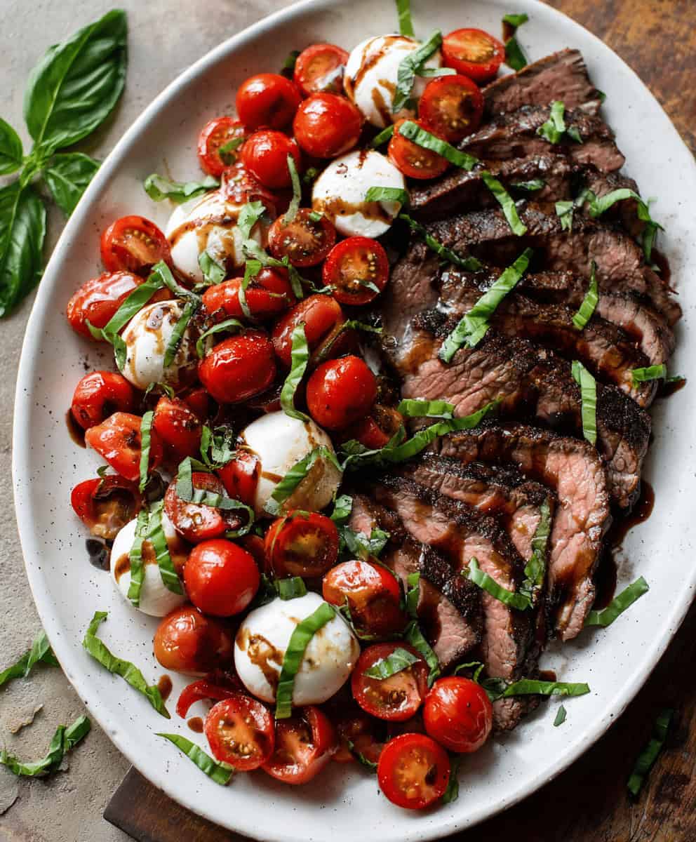 Step 6: Assemble the Caprese Arrange the sliced steak on a serving platter. Top with cherry tomatoes (halved if desired), diced fresh mozzarella, and thinly sliced basil. Drizzle with the reserved balsamic dressing.