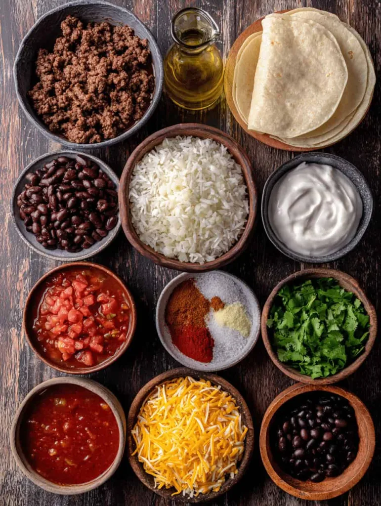 Step 5: Assemble the Burritos Place each warm tortilla on a flat surface. In the center of each tortilla, layer 1/4 cup cooked rice, 1/4 cup black beans, a generous portion of the beef mixture, and about 1/3 cup shredded cheese.