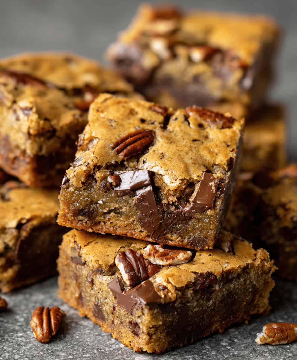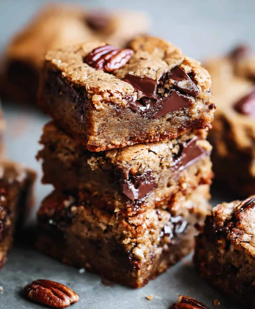 The combination of textures – from the chewy blondie base to the crunchy pecans and melty chocolate chunks – creates an irresistible eating experience. Whether you’re bringing them to a potluck, serving them at a holiday gathering, or simply treating yourself to something special, these blondies are guaranteed to impress.