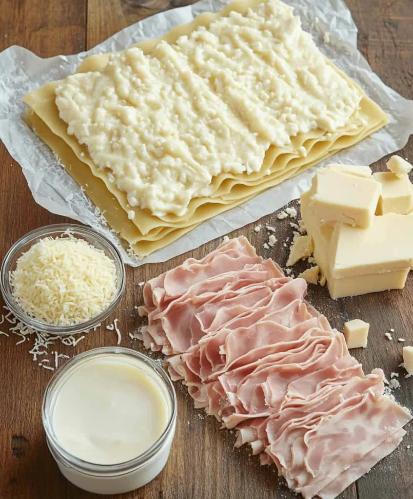 - Add another layer of noodles, followed by the remaining chicken and ham.