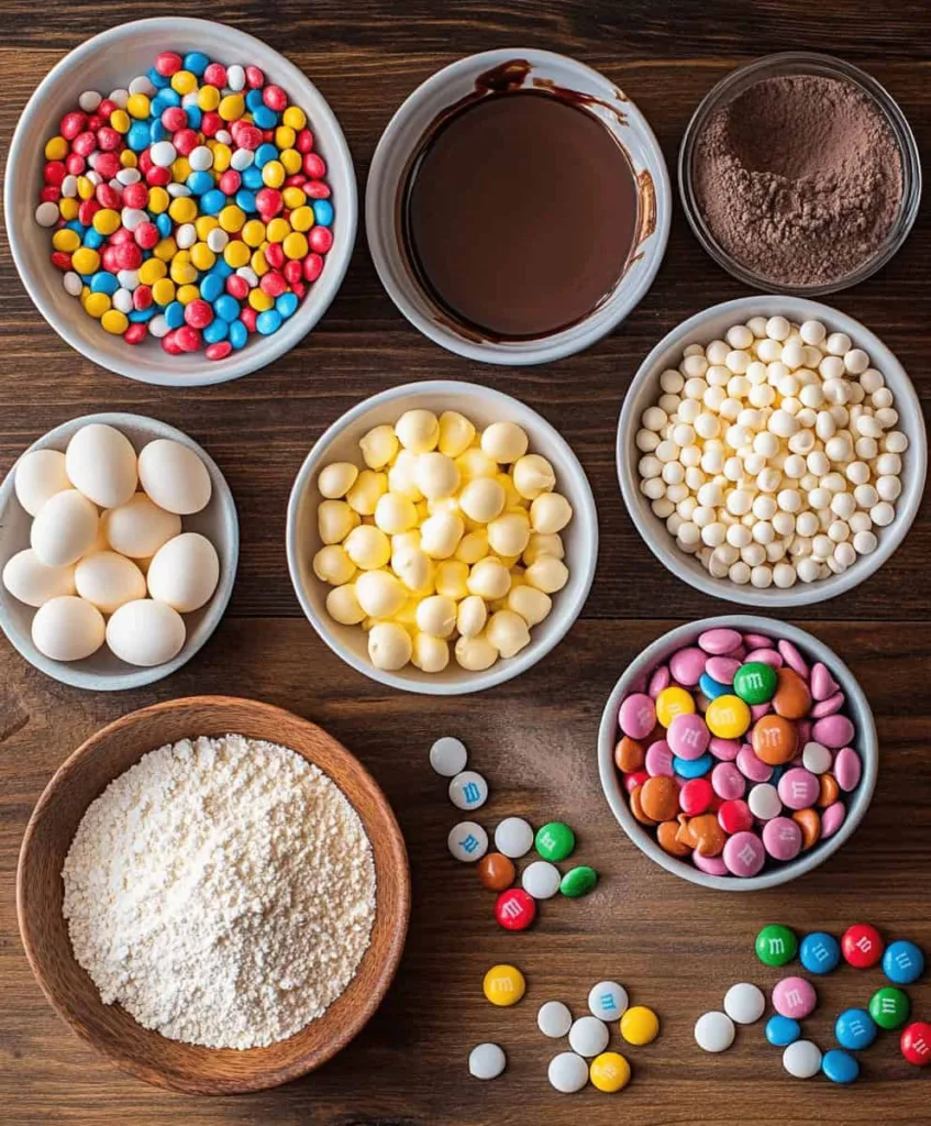 - Add toppings: Sprinkle the remaining white chocolate chips and M&M’s over the top of the brownie batter.