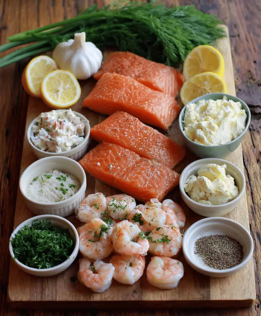 Nutritional Benefits: This recipe is high in protein and omega-3 fatty acids from the salmon, while the crab and shrimp provide additional lean protein. The dish is relatively low in carbohydrates and provides essential nutrients like vitamin D, selenium, and B vitamins.