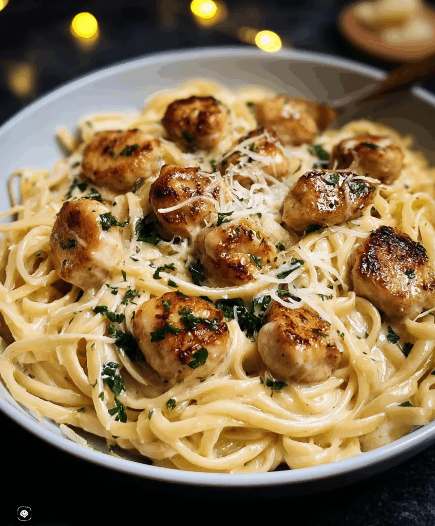 This dish is more than just pasta. It’s a quick, 30-minute rescue that turns simple ingredients into a gourmet meal. Tender chicken bites in buttery garlic and a rich Parmesan cream sauce make it a comfort food dream.