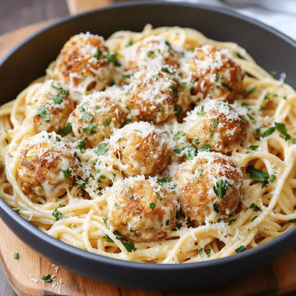 A delicious and comforting dish featuring tender garlic butter chicken balls served with creamy Parmesan pasta. Perfect for a cozy dinner at home.