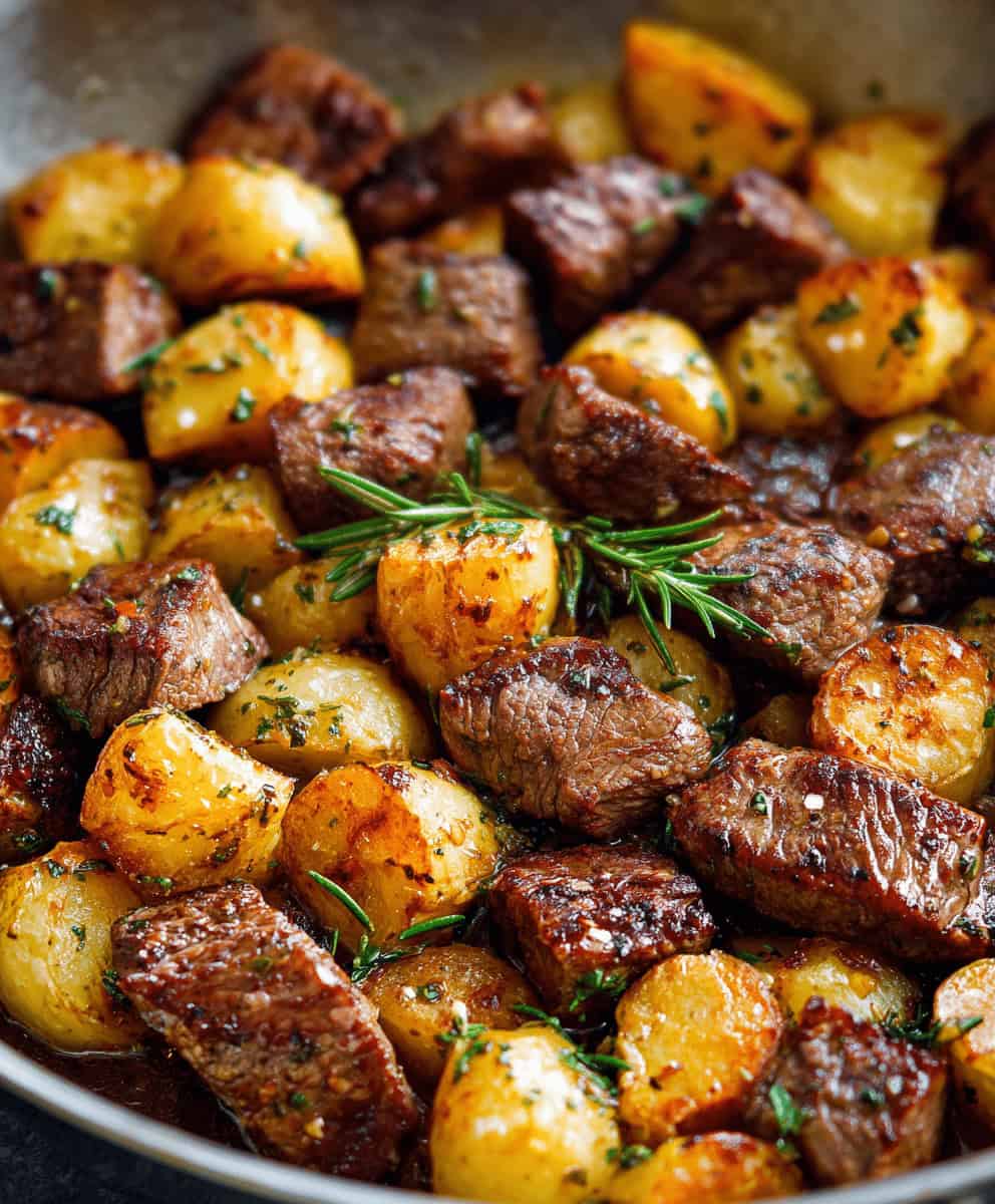 Step 5: Combine and Finish Return the cooked potatoes to the pan with the steak bites. Toss everything together gently to coat with the garlic butter and herbs. Taste and adjust seasoning with additional salt and pepper if needed. Serve immediately while hot.
