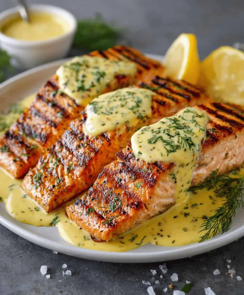 Serve: 17. Plate the grilled salmon and generously spoon the warm Dijon mustard sauce over each fillet 18. Garnish with additional fresh dill and serve immediately