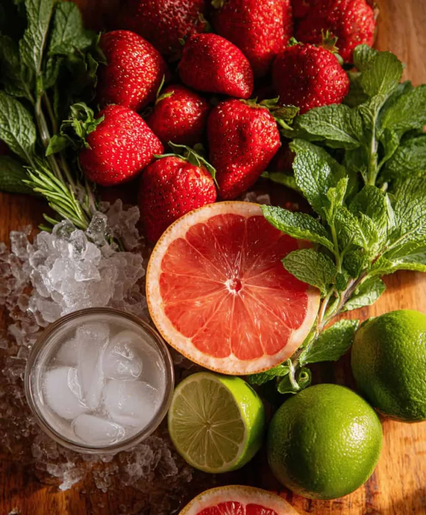 Step 5: Top and Garnish Top with soda water to taste, typically 2-3 ounces. Garnish with fresh mint leaves and either strawberry slices or grapefruit wedges depending on your fruit choice.