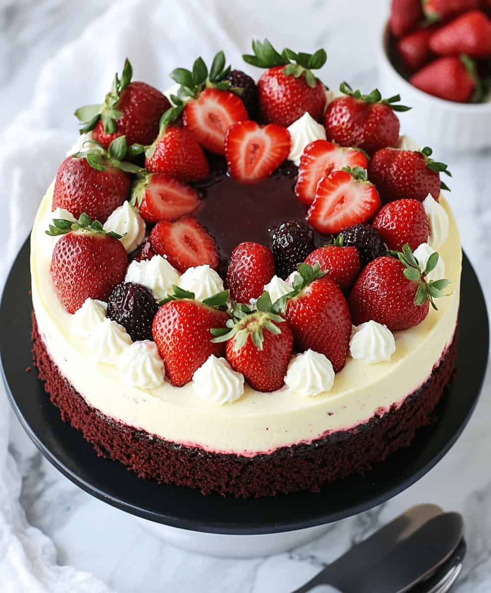 This Ultimate Red Velvet Strawberry Cheesecake is the perfect marriage of two beloved desserts. The moist, tender red velvet cake base provides a beautiful contrast to the smooth, tangy cheesecake layer above it. The vibrant red color creates a stunning visual presentation, while the fresh strawberry topping adds a burst of natural sweetness and a pop of color that makes this dessert absolutely irresistible.